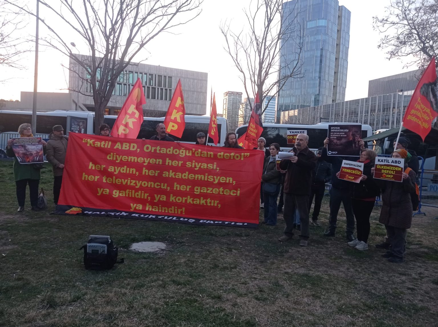 HKP olarak bu acımasızlığı, bu saldırganlığı, bu vicdansızlığı protesto etmek için, bu hayduda karşı öfkemizi, kinimizi haykırmak için, kendilerine yerli işbirlikçileri AKP’giller’in hırsızlama yaparak peşkeş çektiği Atatürk Orman Çiftliği arazisi üzerinde kaçak olarak kondurttuğu ABD Büyükelçilik Binası önünde sloganlarımızı haykırdık:
