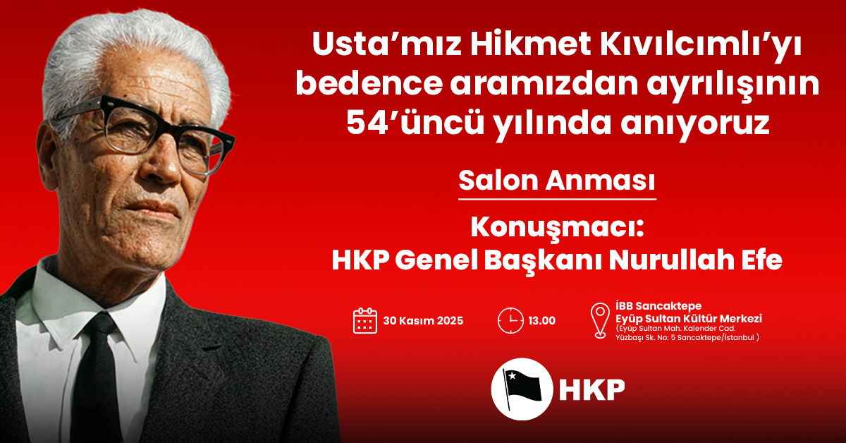 Batılı Emperyalist Haydutlara karşı Yörük Ali Efe’nin komutası altında elde silah ölümüne savaşan, daha 17 yaşındayken Köyceğiz Kuvayimilliye Askeri Komutanlığına getirilen, İkinci Kurtuluş Savaşı’mızın Önderi Hikmet Kıvılcımlı’yı, bedence aramızdan ayrılışının 54’üncü yılında salon etkinliğiyle anıyoruz. Anma etkinliğimizde Kızıl Savaş Bayrağı Hikmet Kıvılcımlı’nın en iyi öğrencisi, sağlığında onunla omuz omuza mücadele etmiş olan Genel Başkan’ımız Nurullah Efe de bir konuşma yapacaktır. Tüm Halkımızı Salon Anması etkinliğimize davet ediyoruz.